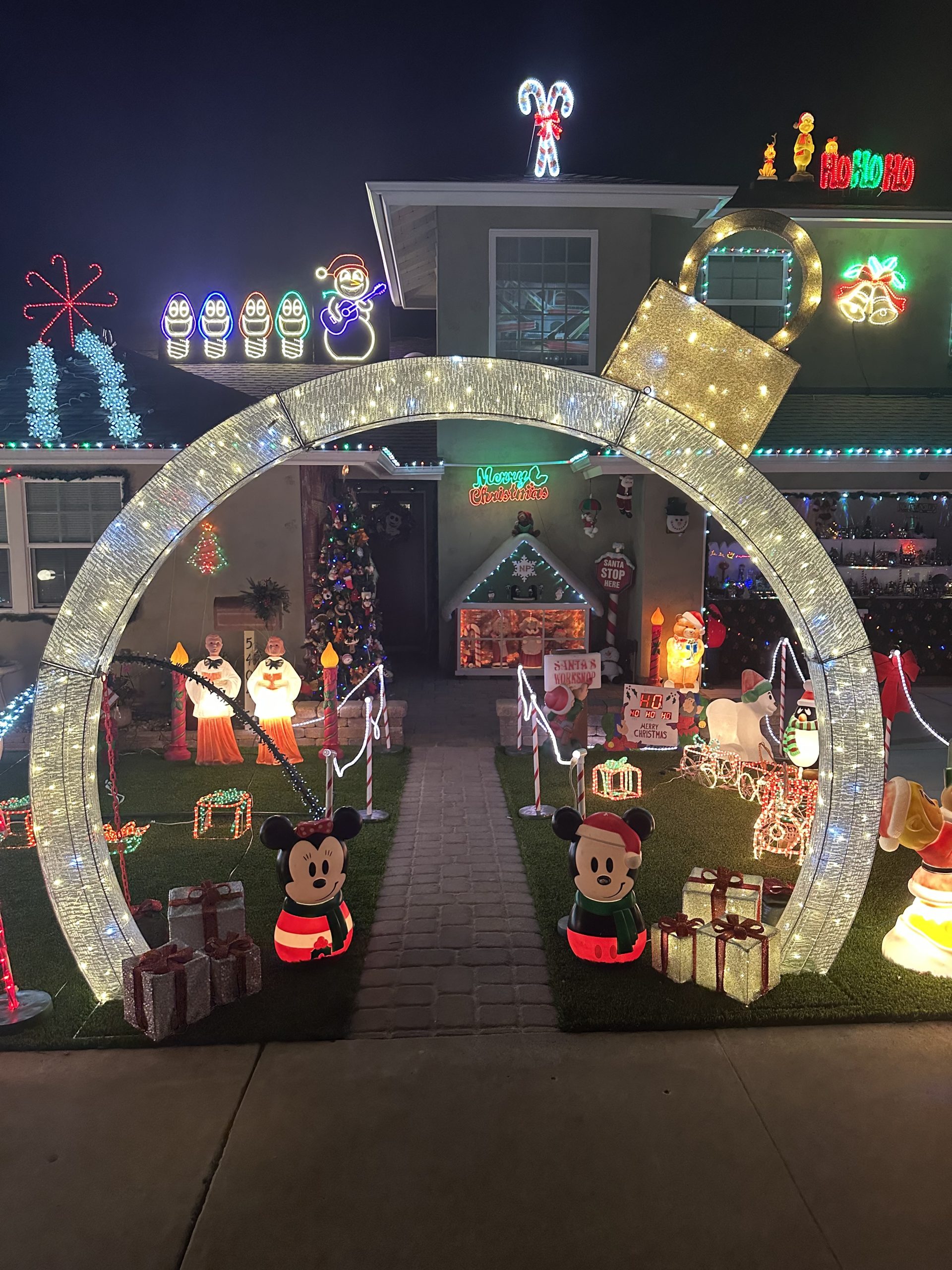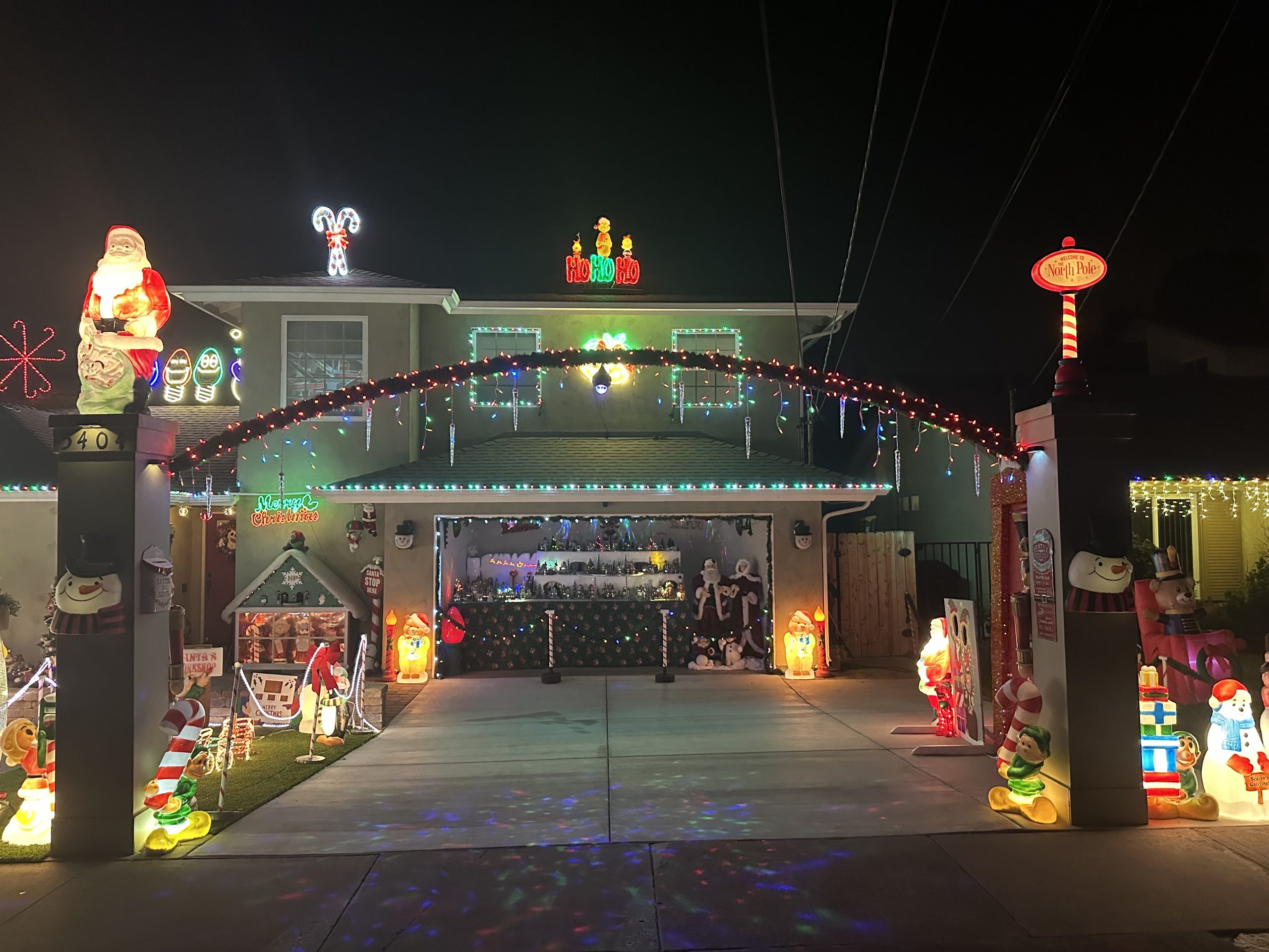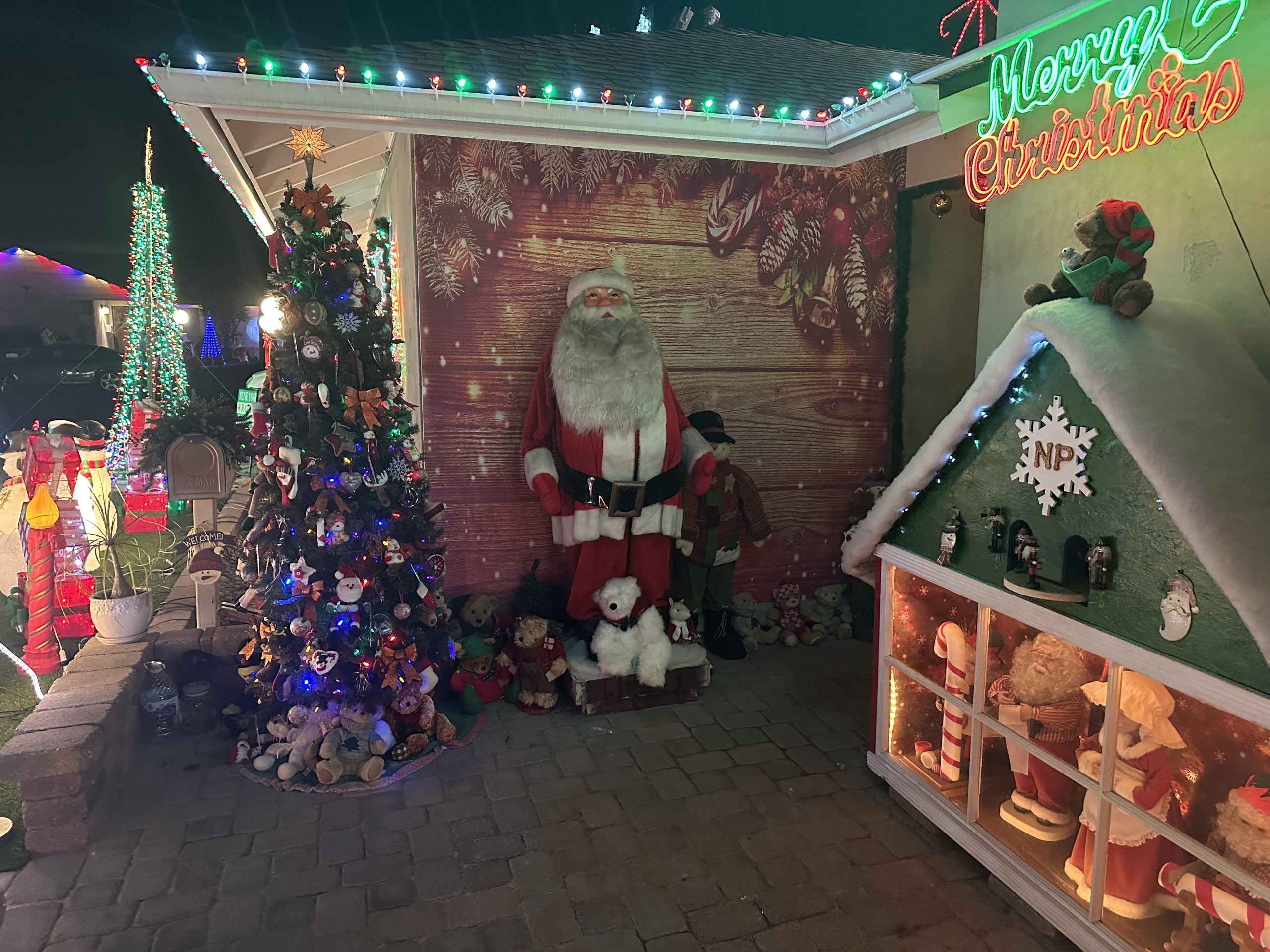 We have an eclectic display of blowmolds, diy Santa house with animated characters, computerized lights show, garage display with dept56 North Pole village and 3 O gauge trains, selfie station, virtual Santa, pneumatic candy cane box and a snowman snow making machine on weekends. Hope to see you there.