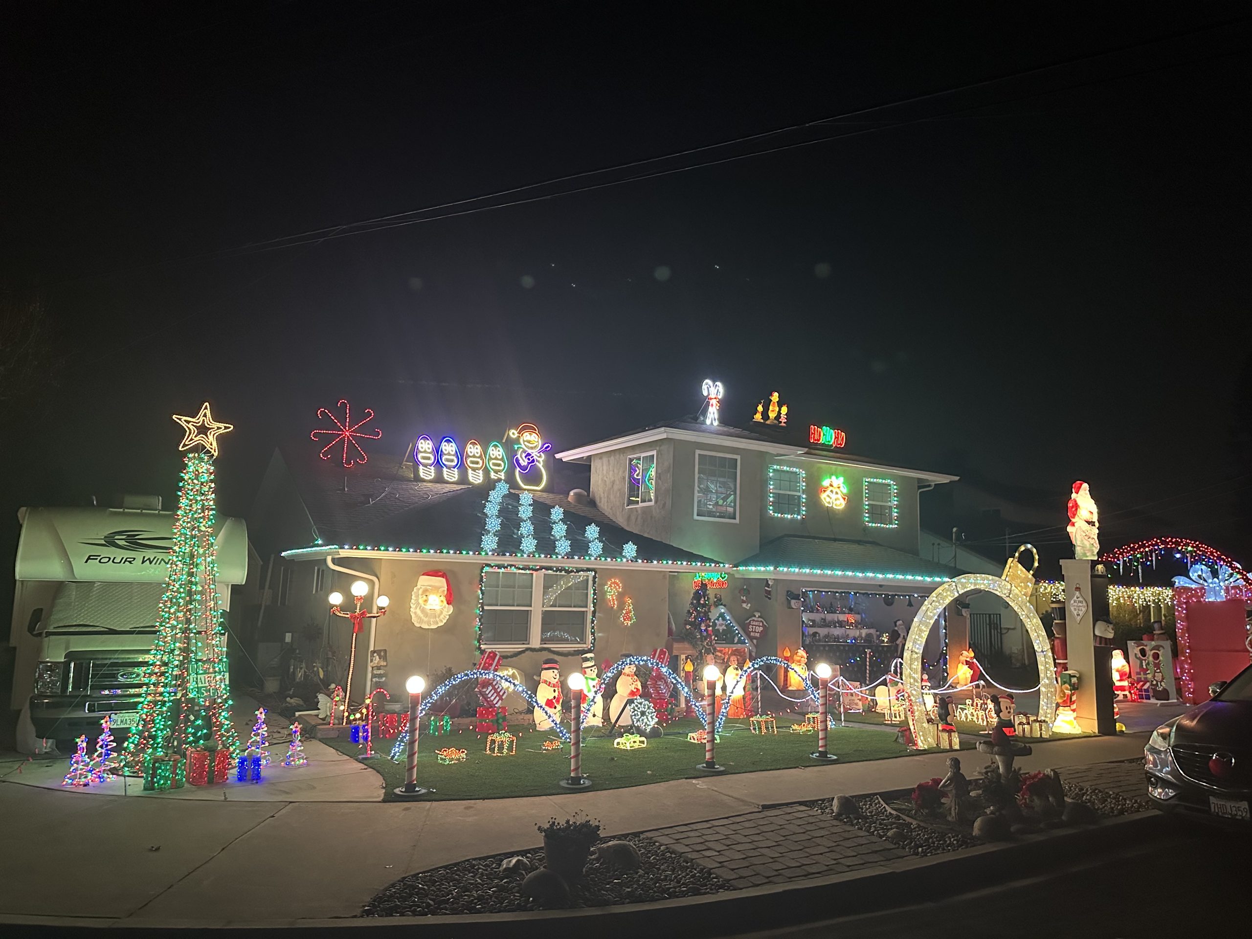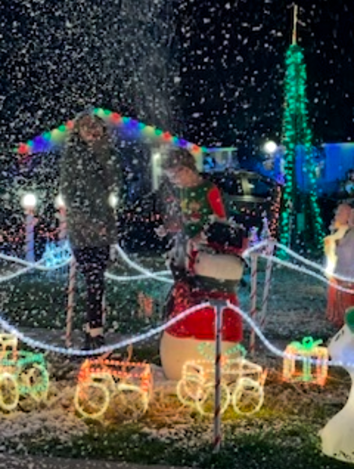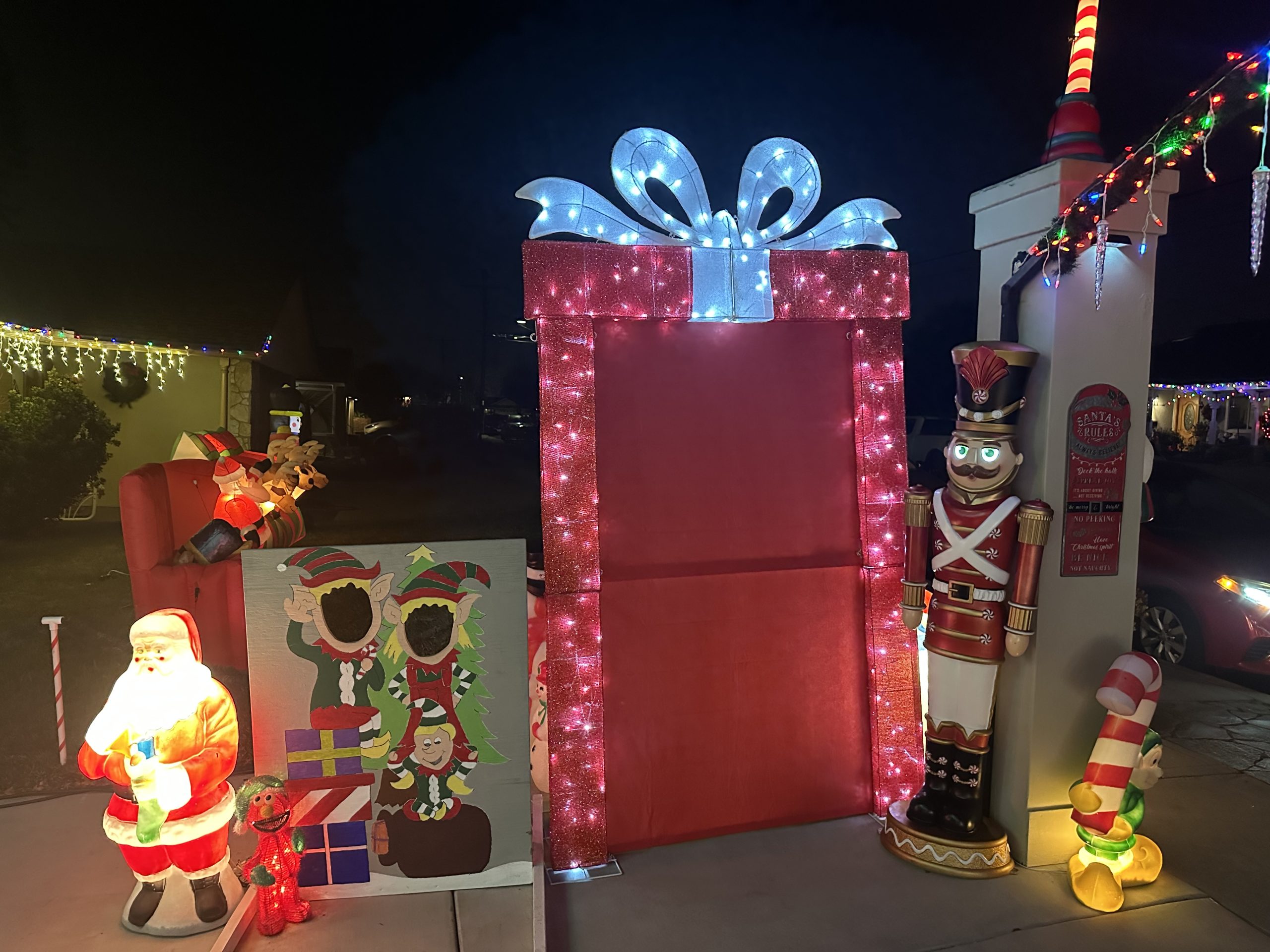 We have an eclectic display of blowmolds, diy Santa house with animated characters, computerized lights show, garage display with dept56 North Pole village and 3 O gauge trains, selfie station, virtual Santa, pneumatic candy cane box and a snowman snow making machine on weekends. Hope to see you there.