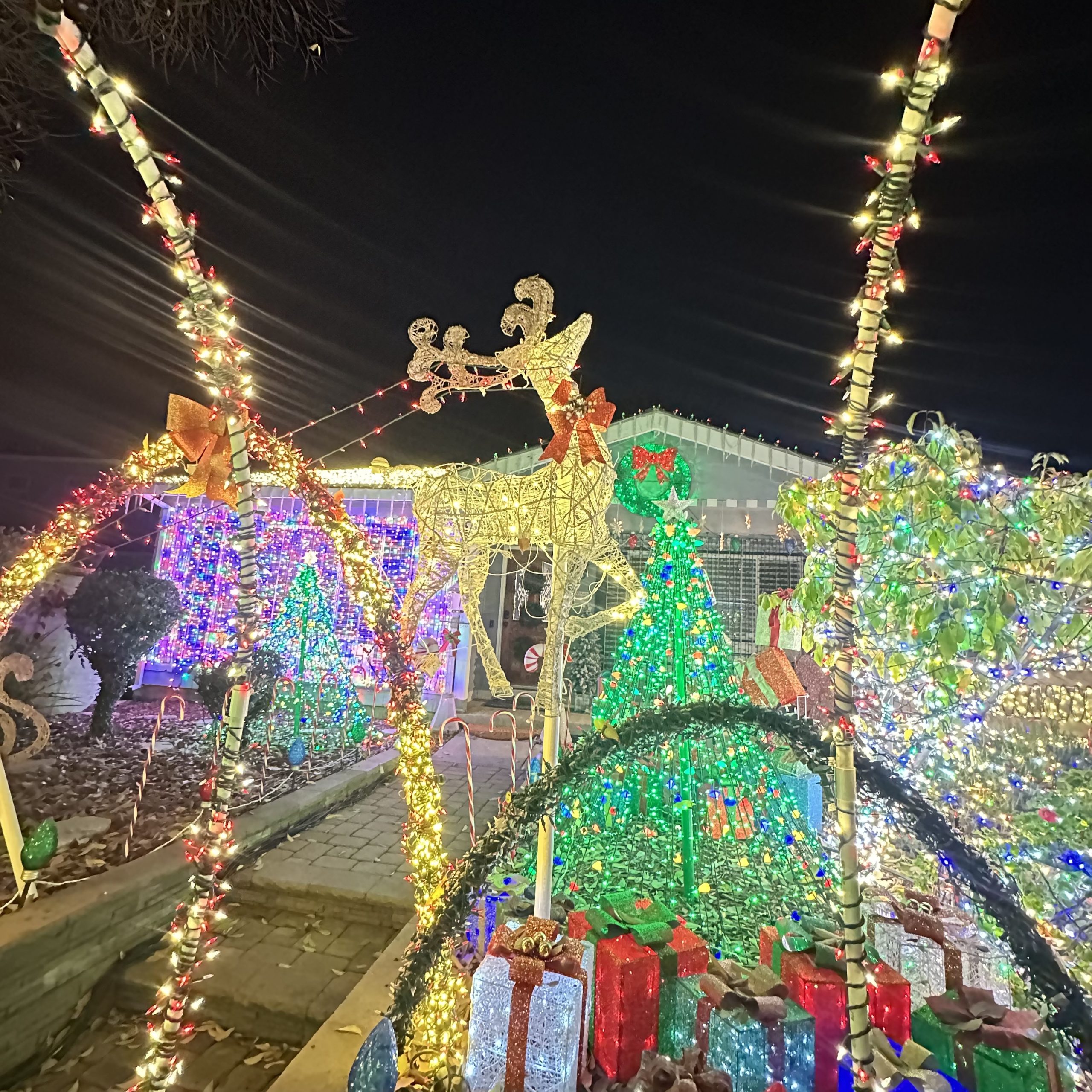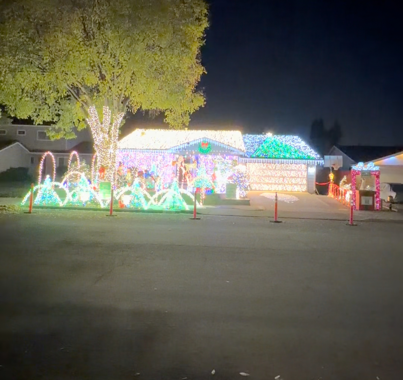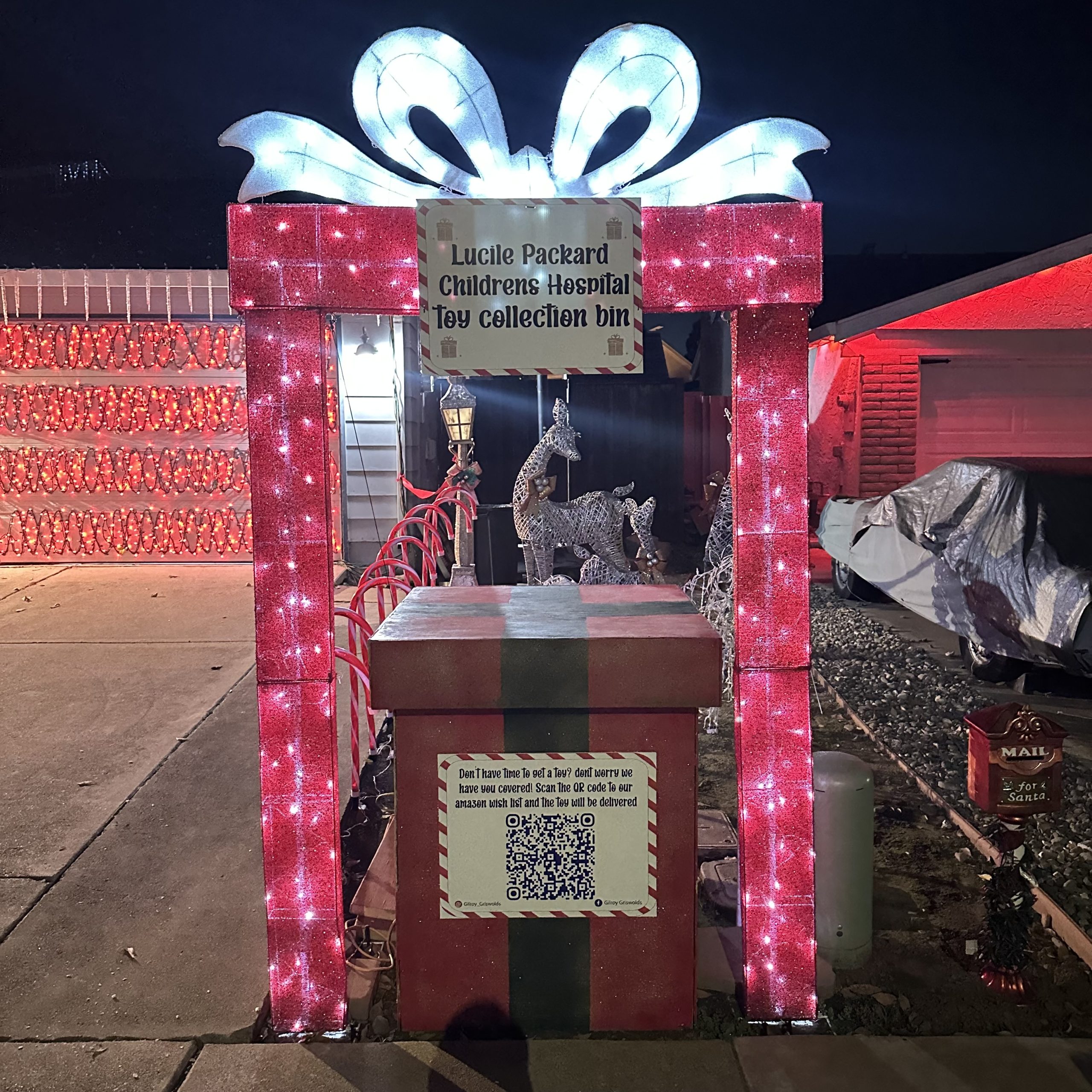 More than 71,000 lights synced to over an hour of your favorite Christmas songs! From 6:30-8:30 every Friday and Saturday in December (up until Christmas) we hand out free popcorn, hot chocolate and candy canes. From 6-9 PM every Friday and Saturday in December we run fake snow machines for 10 minutes at the top and bottom of the hour. The most important part of our display is our annual toy drive for Lucile Packard. We have a toy bin that is outside 24 hours a day 7 days a week the entire month of December. For those that don’t have time to go shopping we have an amazon wish list set up where the toys will be dropped off at our house. In 2024 we dropped off 576 toys that were donated to Lucile Packard in Palo Alto California. Stop by and enjoy some Christmas magic!