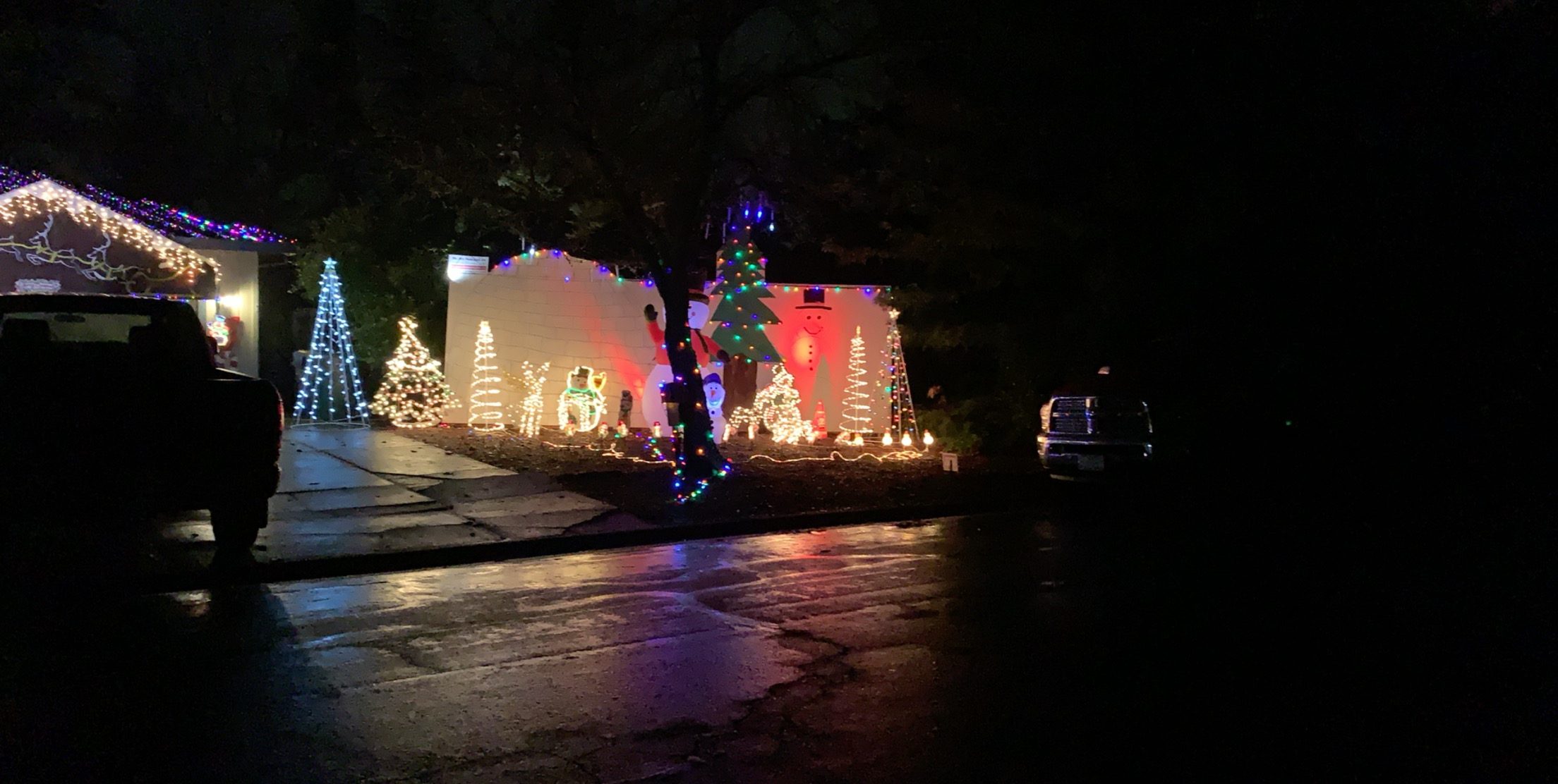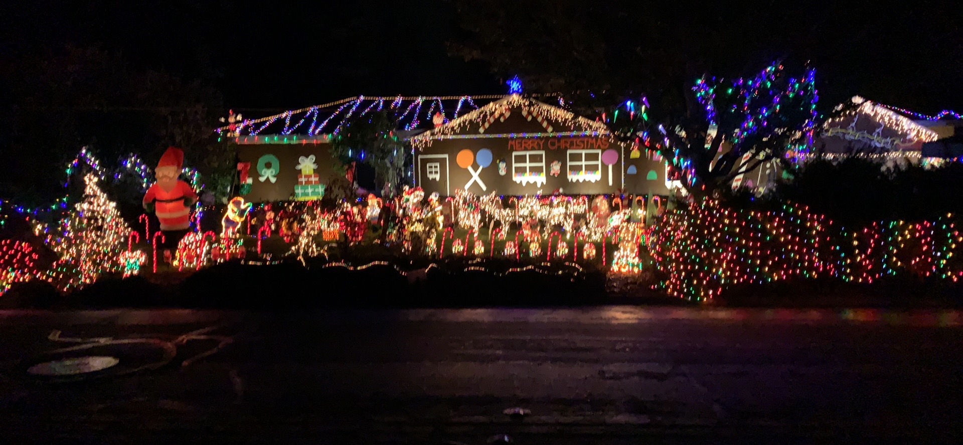 We turn the house into a gingerbread house and give out hot coco and Candy Canes!