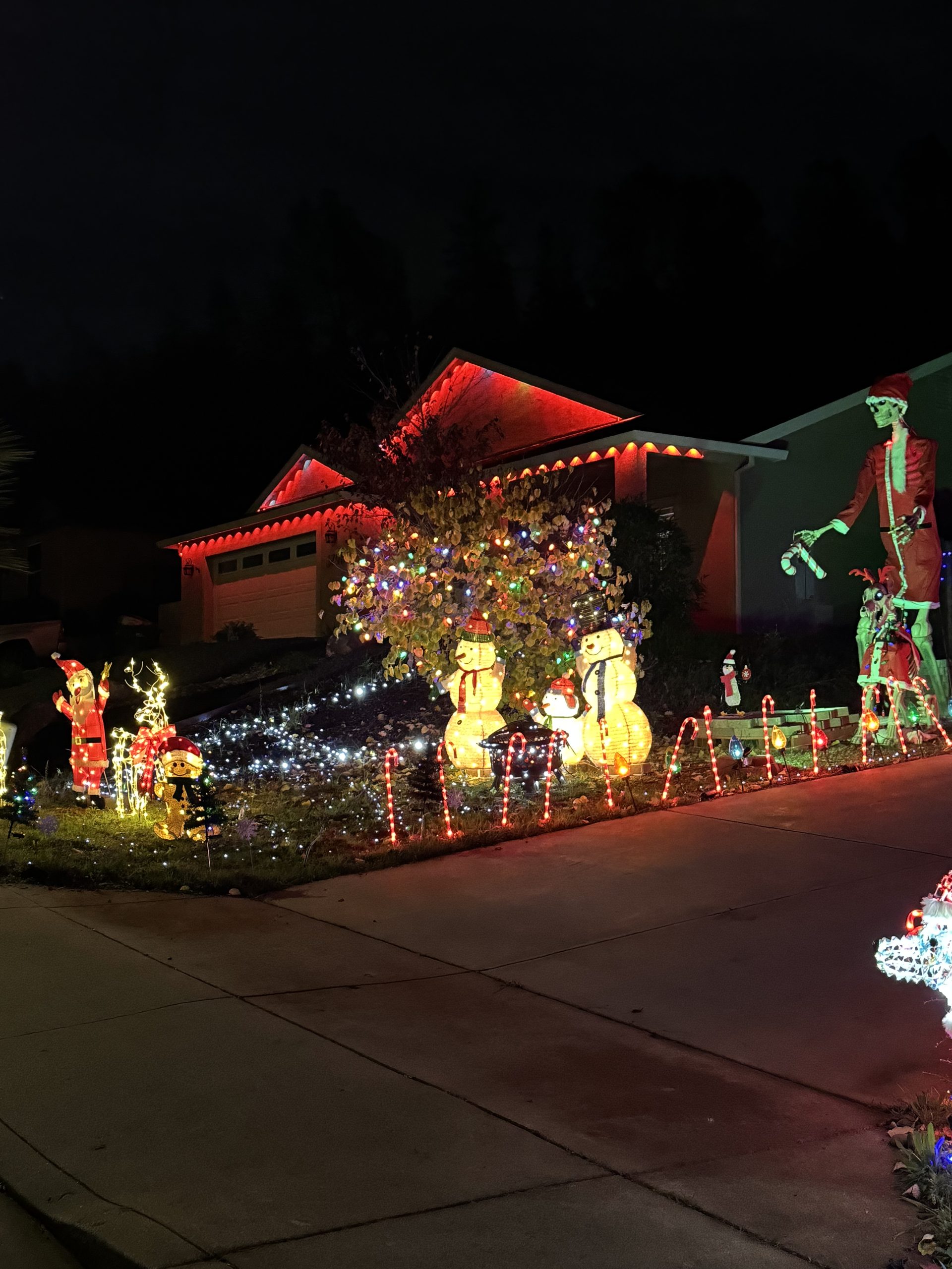 Our display is geared towards kids, with our inflatables, as well as adults for the Christmas magic. We use LED light strands as well as our characters which include our massive 12ft tall skeleton and his skeleton dog in our display. We hope you enjoy our display and we will continue to build on in the years to come.