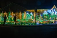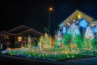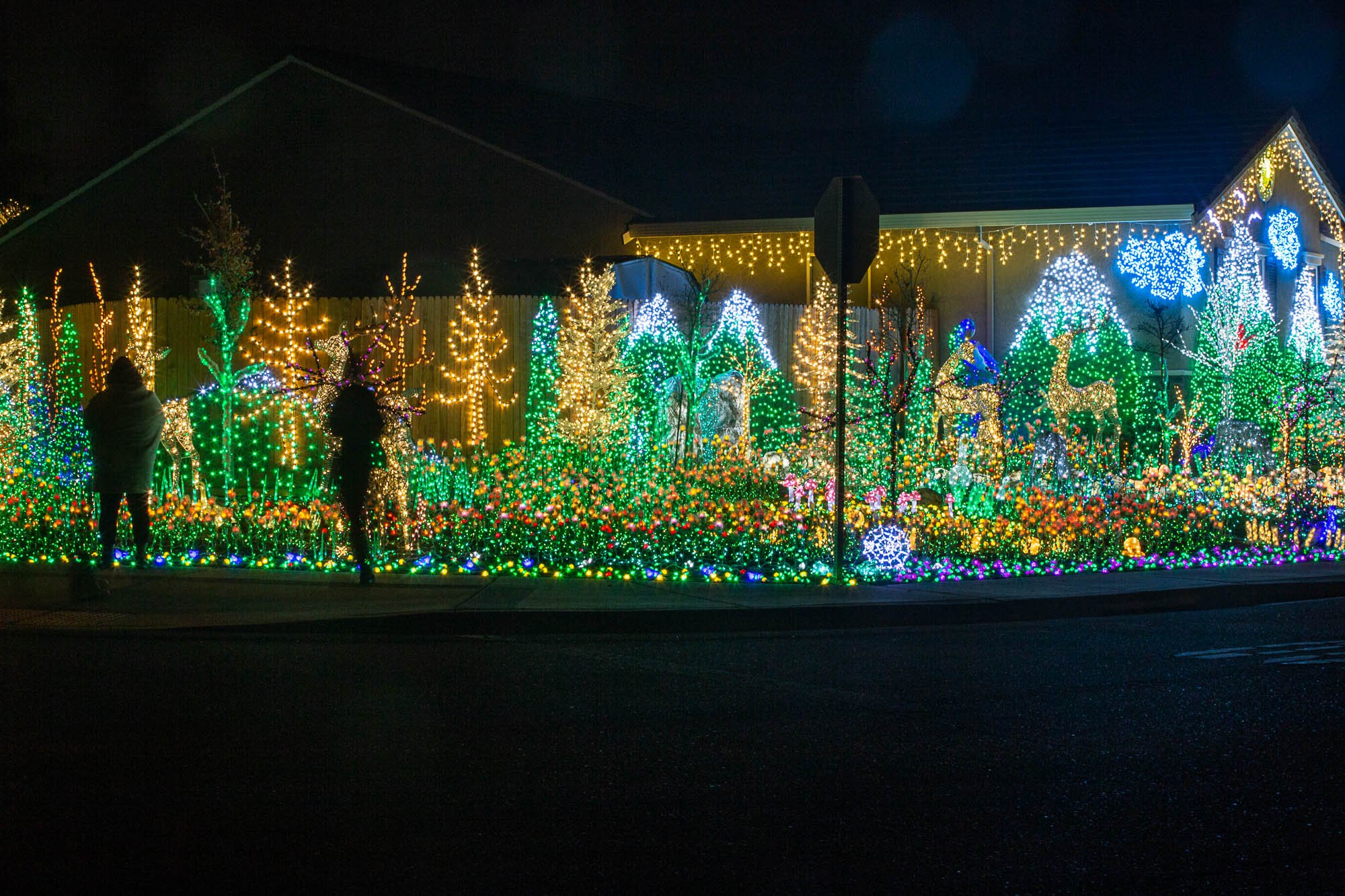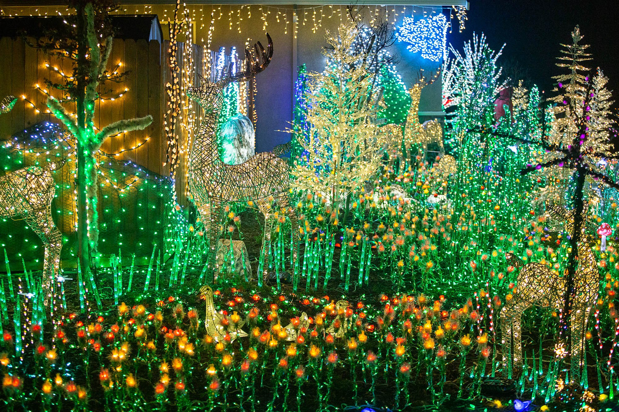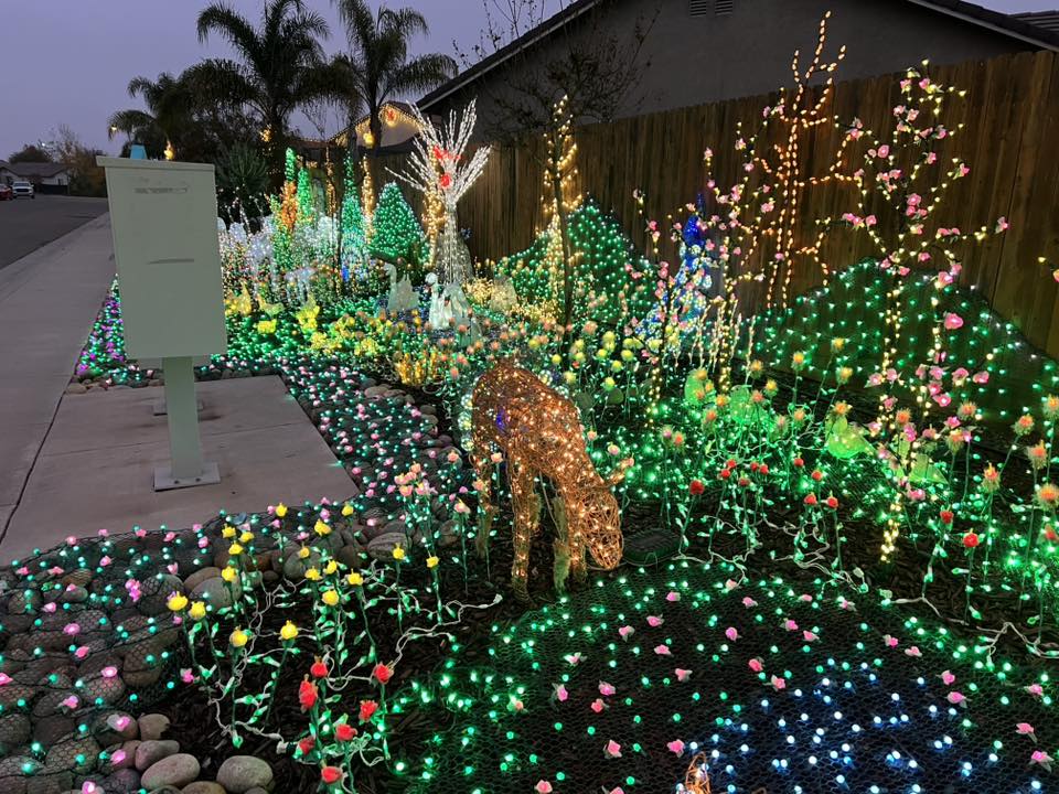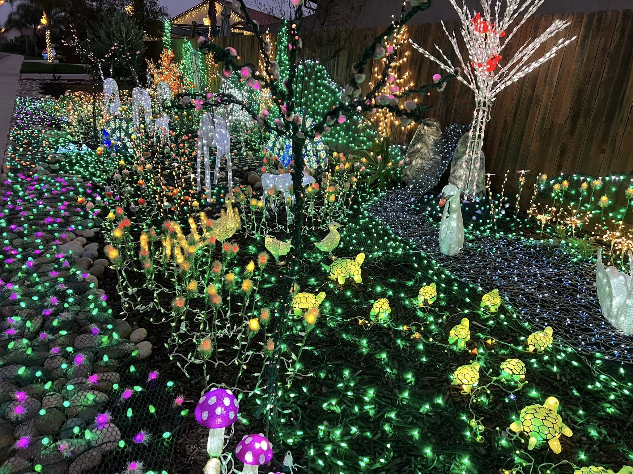 Evelyn’s masterpiece began humbly in 1998 with just two deer—an origin story she loves to share. From there, her imagination took flight. The deer needed flowers to nibble on, then grass, then water and rocks… and before long, her display blossomed into the breathtaking winter wonderland it is today. Here at California Christmas Lights, we completely relate to that creative “snowball effect.”