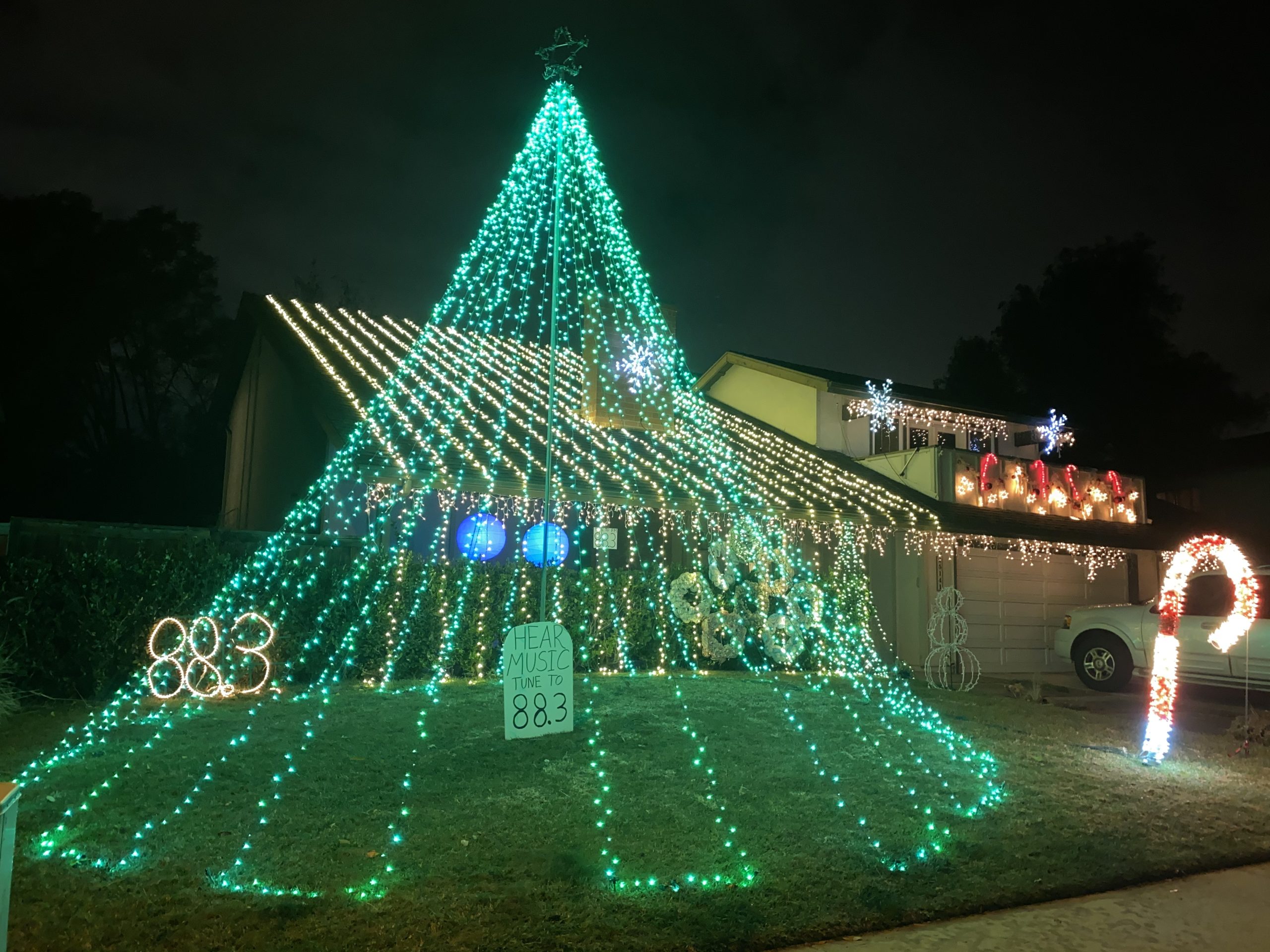 Our Lightshow has been running for 15 years! 64 channels are programmed to over 10 songs that you can listen to in your car on 88.3FM Radio. We have a 20ft tall mega tree, roof lights, giant candy cane, and snowman! Kids love the music and display!