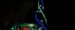 A Disney lovers display. Multiple character yard cutouts. The house is adorned with milti colored lights and dripping icicles. The centerpiece is a 50′ redwood with red, white and blue lights. We have some inflatables and a projection screen playing Disney Christmas classic movies in the window. The garage has a countdown timer and a backdrop for selfies.